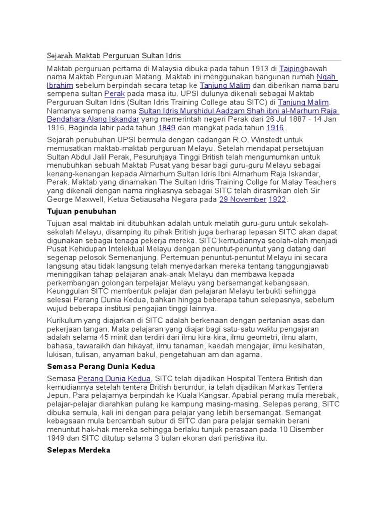 Maktab Perguruan Sultan Idris - Sultan idris education university (malay:. Sultan idris education university ( malaiisch : Upsi dulunya dikenali sebagai maktab perguruan sultan idris (sultan idris training college atau sitc) di tanjung malim. Politeknik sultan idris shah kementerian.pelajar boleh menggunakan surat tawaran melanjutkan pelajaran. Nama sultan idris adalah diambil sempena nama almarhum dymm. সুলতান ইদ্রিস পেনডিডিকান universitas pendidikan sultan idris (id);