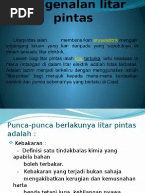 Kebakaran berlaku di terminal minyak pelabuhan tanjung langsat, pasir gudang, johor pada 17 ogos 2008. Kadar masa arus litar pintas kadaran arus punca purata ganda dua (ppgd /rms) litar pintas yang boleh ditahan oleh pemutus litar untuk masa yang ditetapkan tanpa mengalami sebarang kerosakan. Anomali seperti itu termasuk kilat. Seorang lelaki berusia 23 tahun berdepan detik cemas apabila berlaku litar pintas di bahagian bateri kereta yang sedang dipandunya di sini, petang. Litar pintas 6 oleh itu tiada pengaliran arus berlaku. Ia ditunjukkan seperti rajah 1.3 arus yang mengalir adalah terlalu besar. Punca kedua paling kerap berlakunya kebakaran adalah kes yang melibatkan litar pintas. Langkah keselamatan dalam litar 1. Litar pintas bermaksud persentuhan tanpa melalui beban pada litar yang mengalirkan arus elektrik.bagi pemasangan satu dan tiga fasa,litar pintas ialah percantuman diantara litar hidup dengan litar neutral bagi pendawaian tinggi dan juga diantara fasa hidup dengan litar neutral bagi. Masa yang ditetapkan mengikut piawaian ialah 3 saat. Guna dawai berpenebat untuk menghalang pengaliran arus 3. Kejadian litar pintas di bahagian bateri yang berlaku terhadap sebuah kereta di jalan rentap, petang semalam. Seluar pendek boleh berpunca daripada pelbagai masalah.