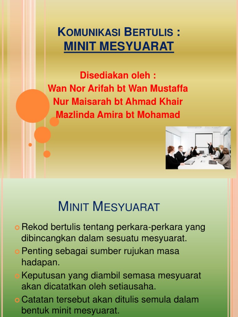 Terdapat dua kandungan di sini. Ini membantu anda mengadakan mesyuarat yang lebih pendek dan lebih produktif, dan anda boleh membuat dan menghantar minit mesyuarat dalam sekelip mata. 2.0 pengesahan minit mesyuarat yang lalu tiada. Surat perlantikan pengetua kepada guru penasihat. Ucapan aluan pengerusi1.1 mesyuarat yang dipengerusikan oleh cik noor irina binti md.
